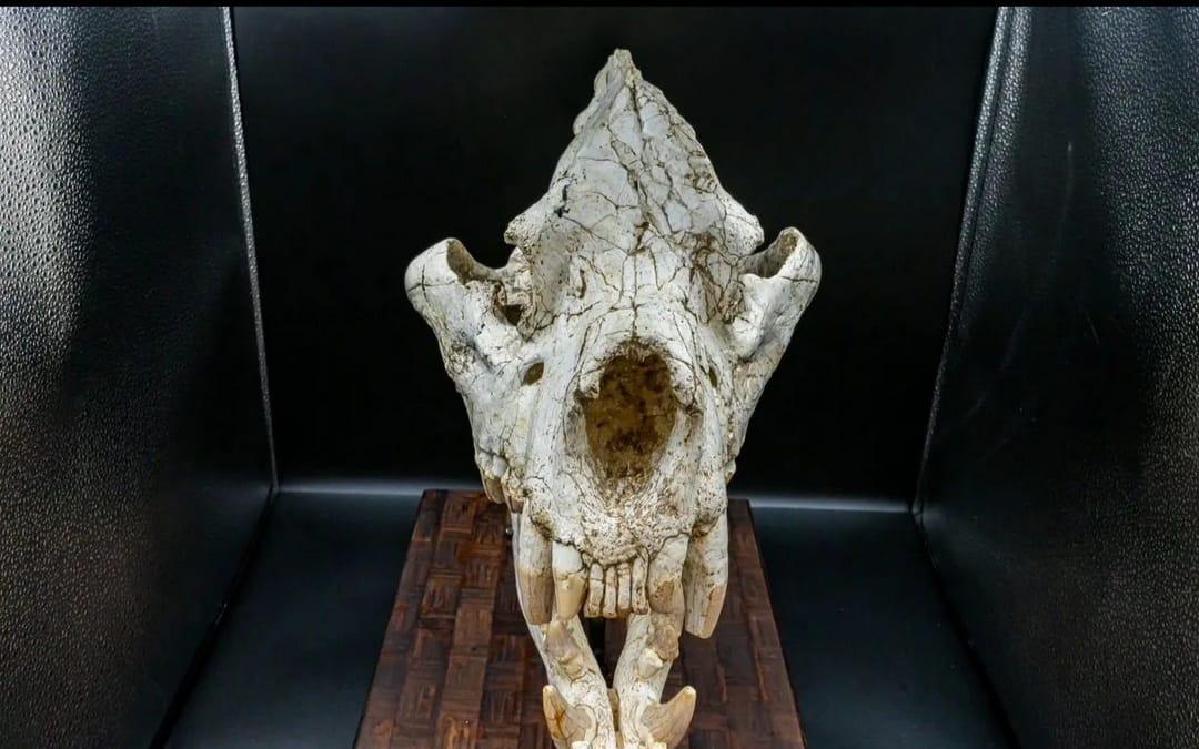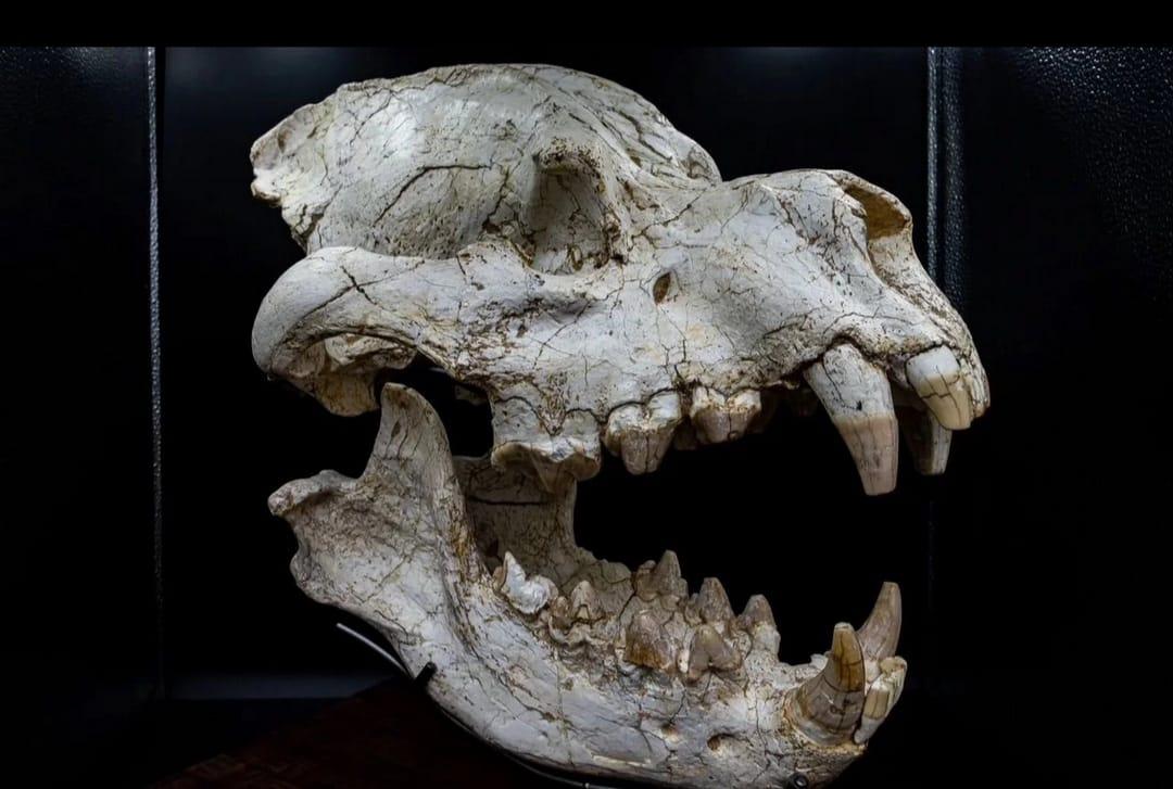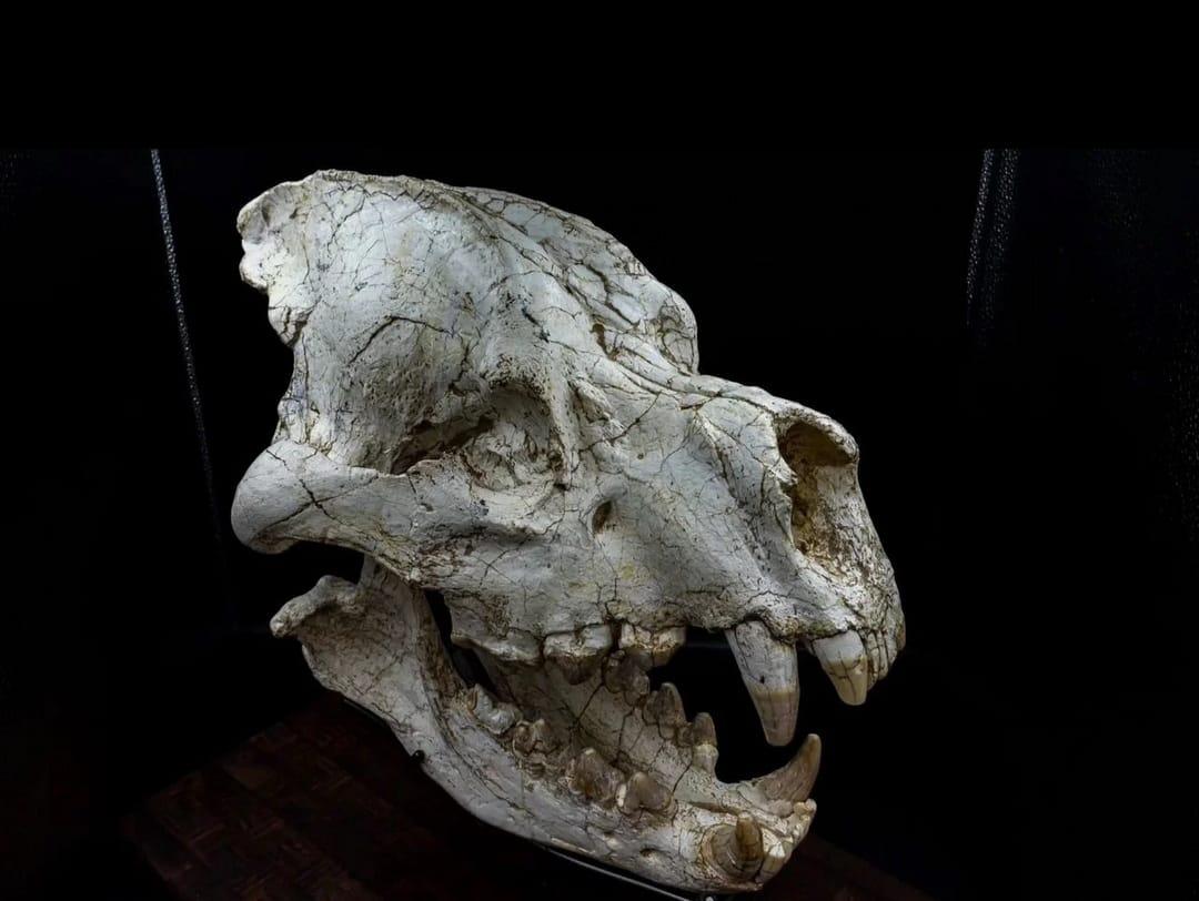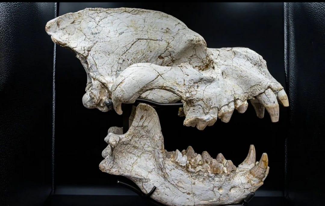 Fossilized skull of the ancient giant hyena Pachycrocuta brevirostris, Eurasian Ice Age. An authentic paleontological specimen for your collections and interiors
